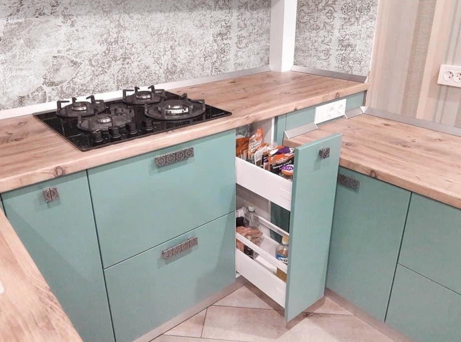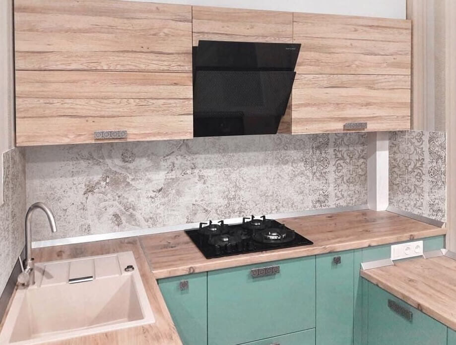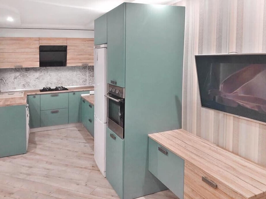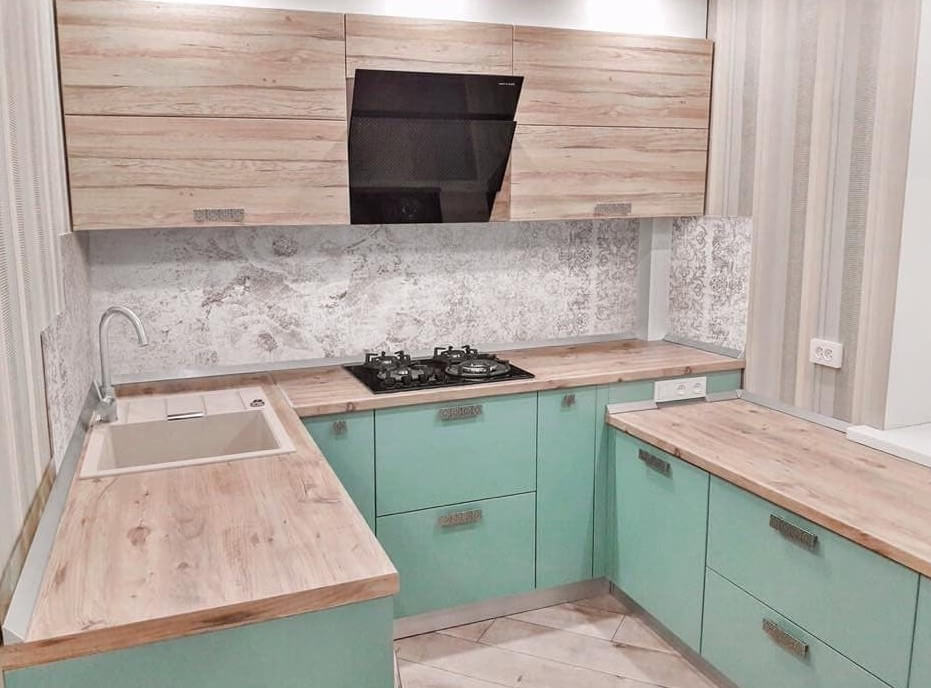 Уютная и свежая кухня с фасадами под дерево. Природную текстуру разбавляет насыщенно-мятный цвет на нижних шкафах. Гарнитур П-образной формы, функциональный и вместительный. Идеально впишется в интерьер квартиры или дачного дома в современном стиле.